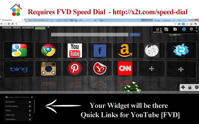 Easy to use Quick links for YouTube Widget allows you to quickly access to most popular YouTube URLs. In the settings you can customize and add new YouTube pages.