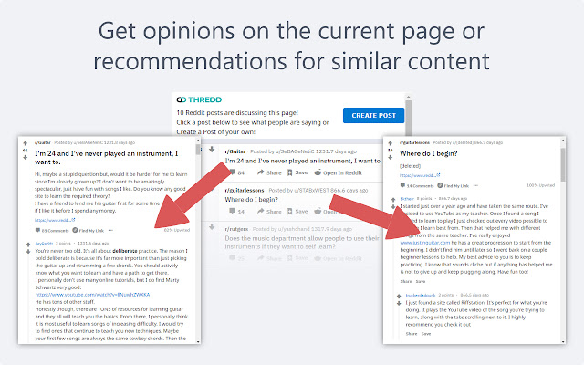 HOW IT WORKS: Simply browse the web as normal. When the extension icon shows a red badge, click it to see what Thredd has found. You can read, reply to, or even start your own discussions. Don't forget to check out the various Reddit communities you stumble upon to see what else they've been sharing!